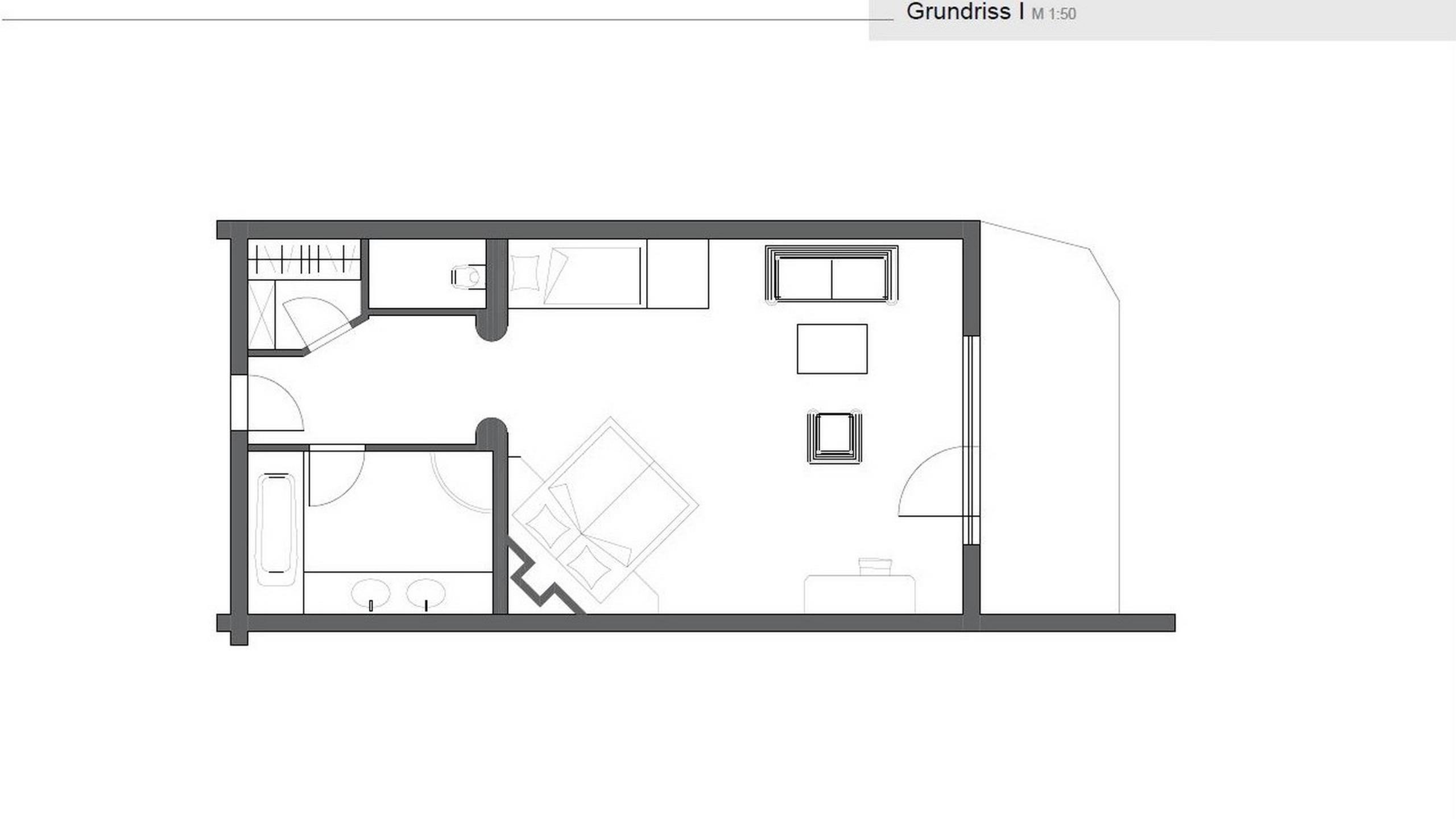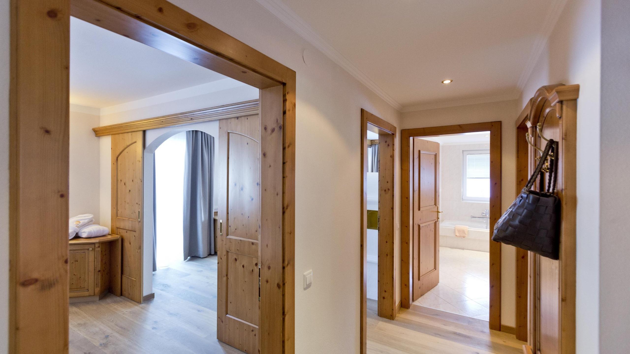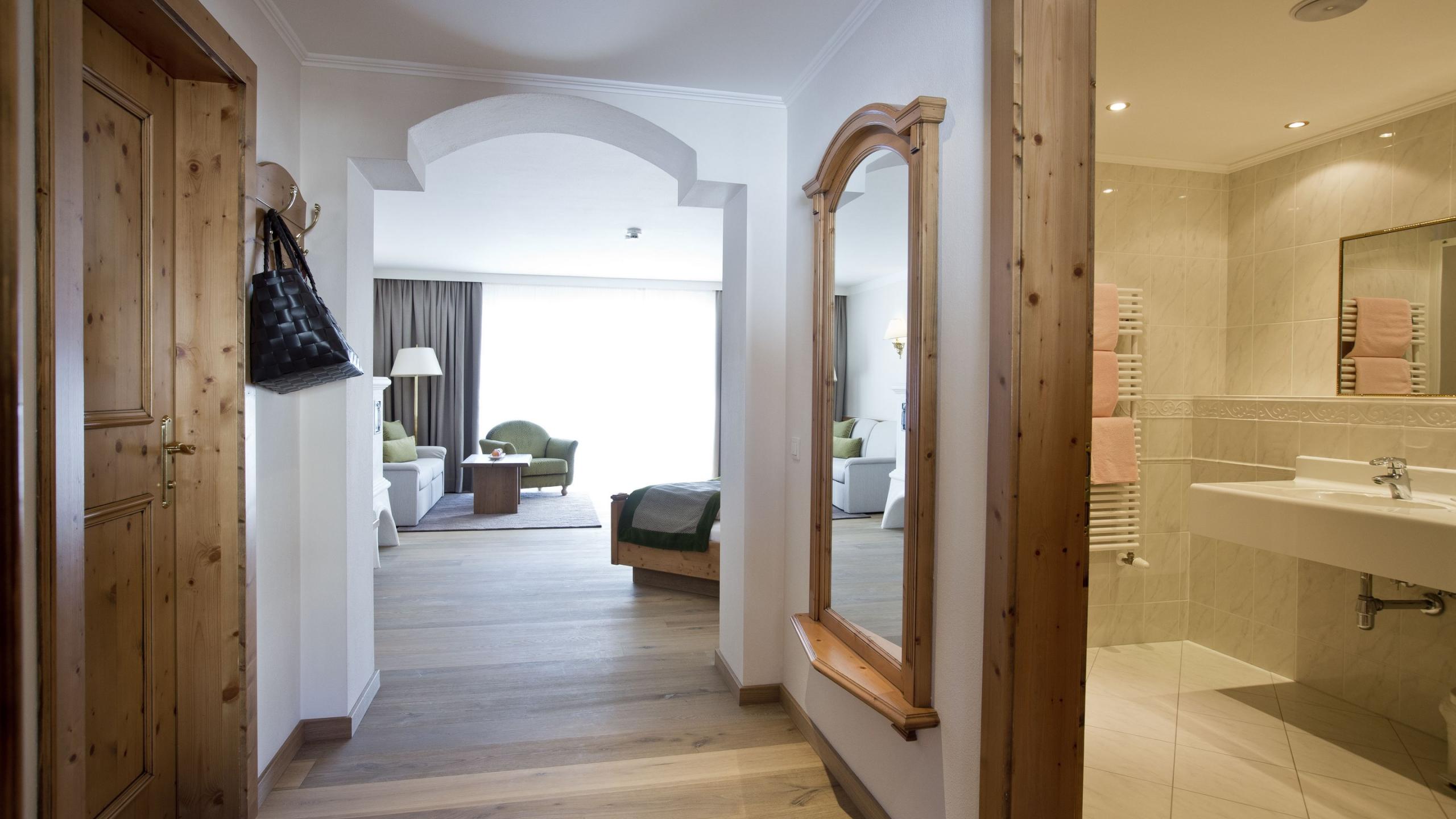 Suite deluxe in modern country house style with wooden floor, bedroom, spacious sitting area with tiled stove, walk-in closet, south-facing balcony, TV, minibar, telephone, and safe. Bathroom with bathtub, shower, and separate WC.