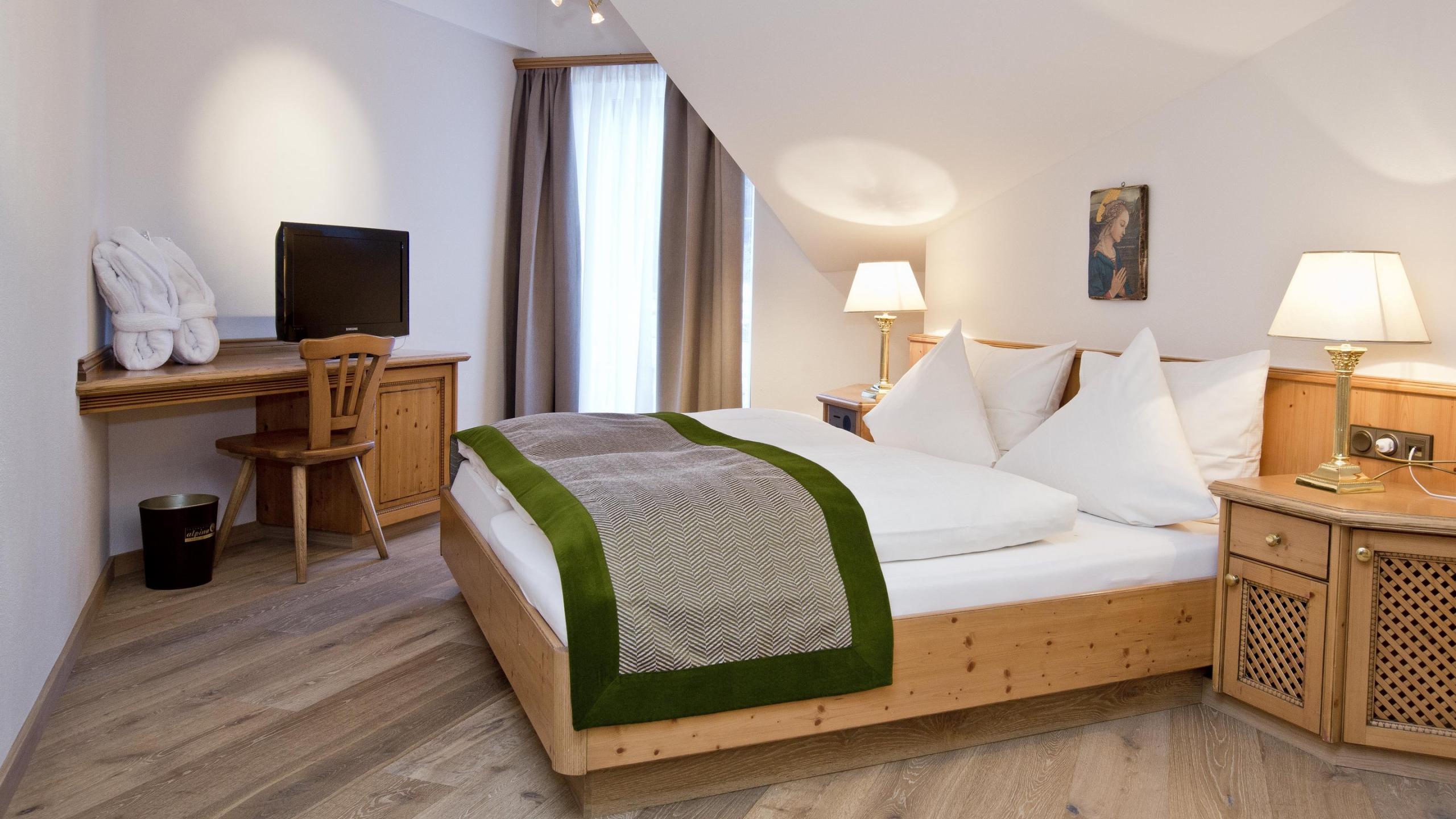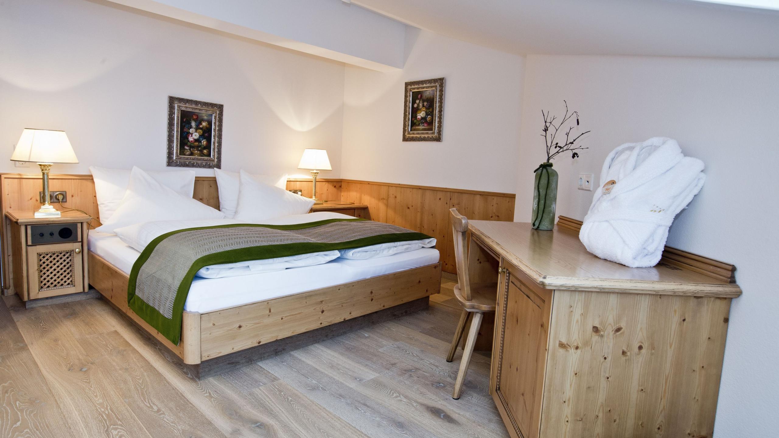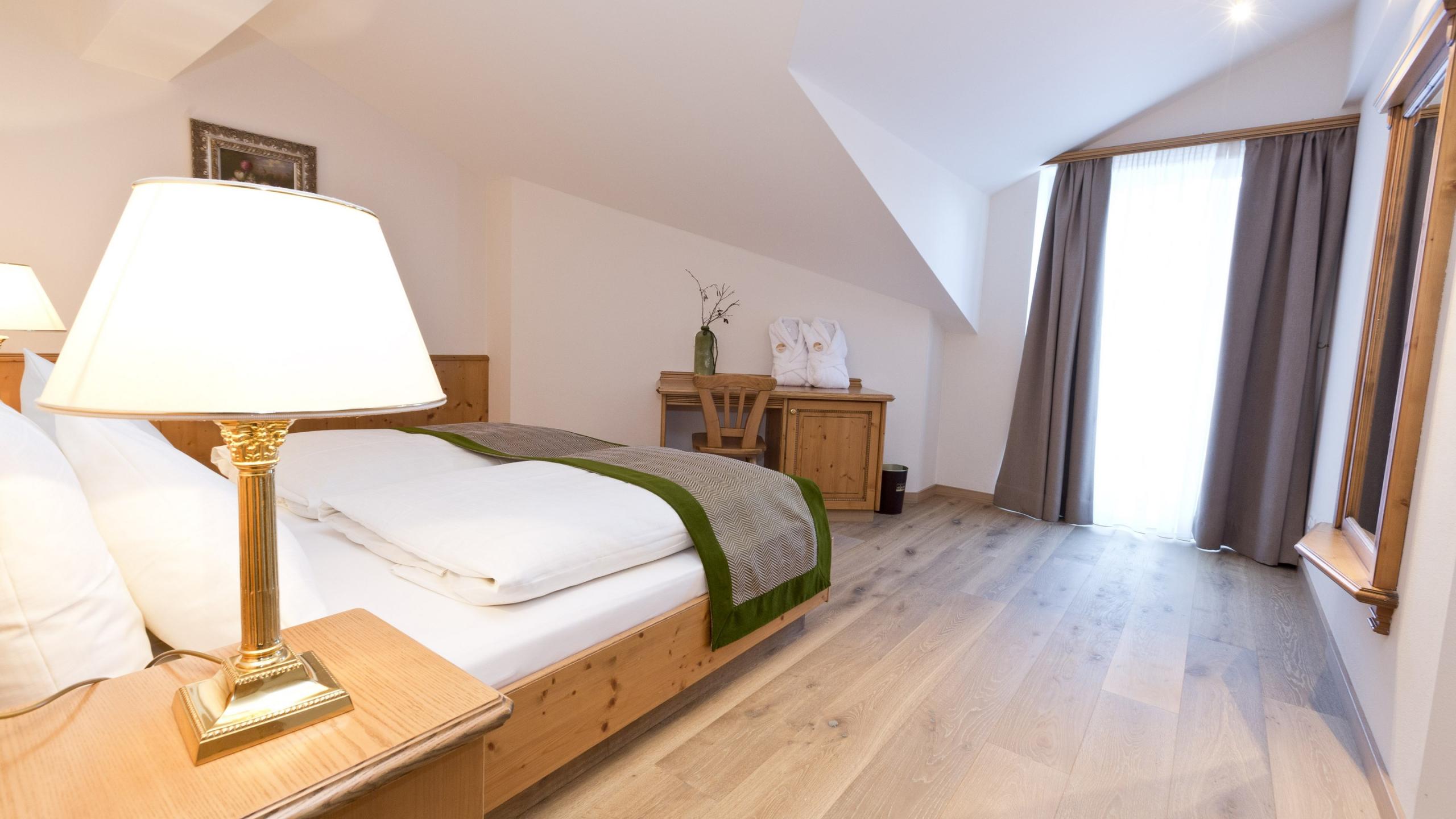 Studio in modern country house style with wooden floor with 2 bedrooms, separate living room with sitting area and tiled stove, walk-in closet, several balconies, TV, minibar, telephone, and safe. 2 bathrooms: one with bathtub, shower, and WC – the other one with shower and WC. Minimum occupancy: 3 people (4 people during winter season).