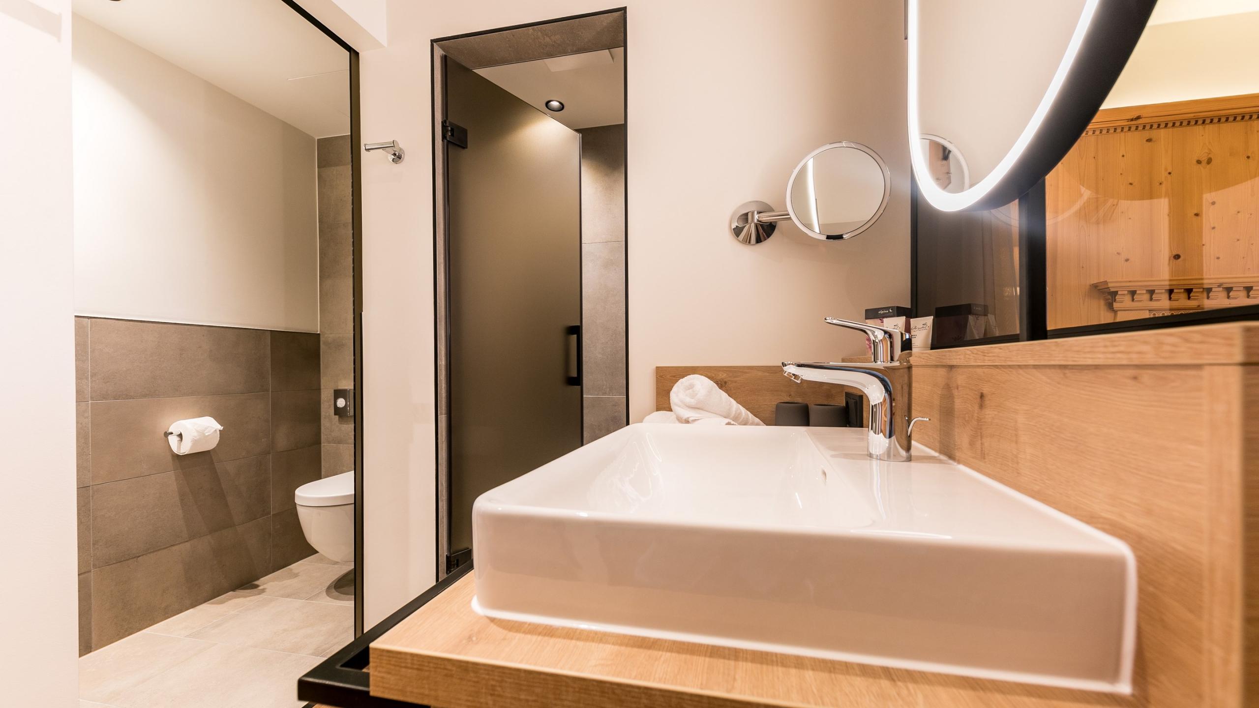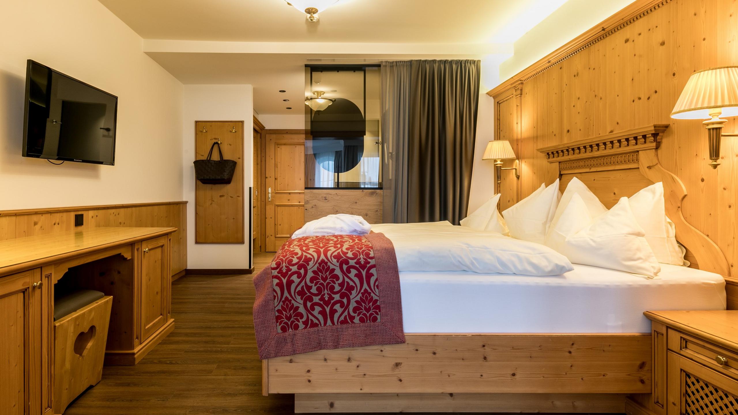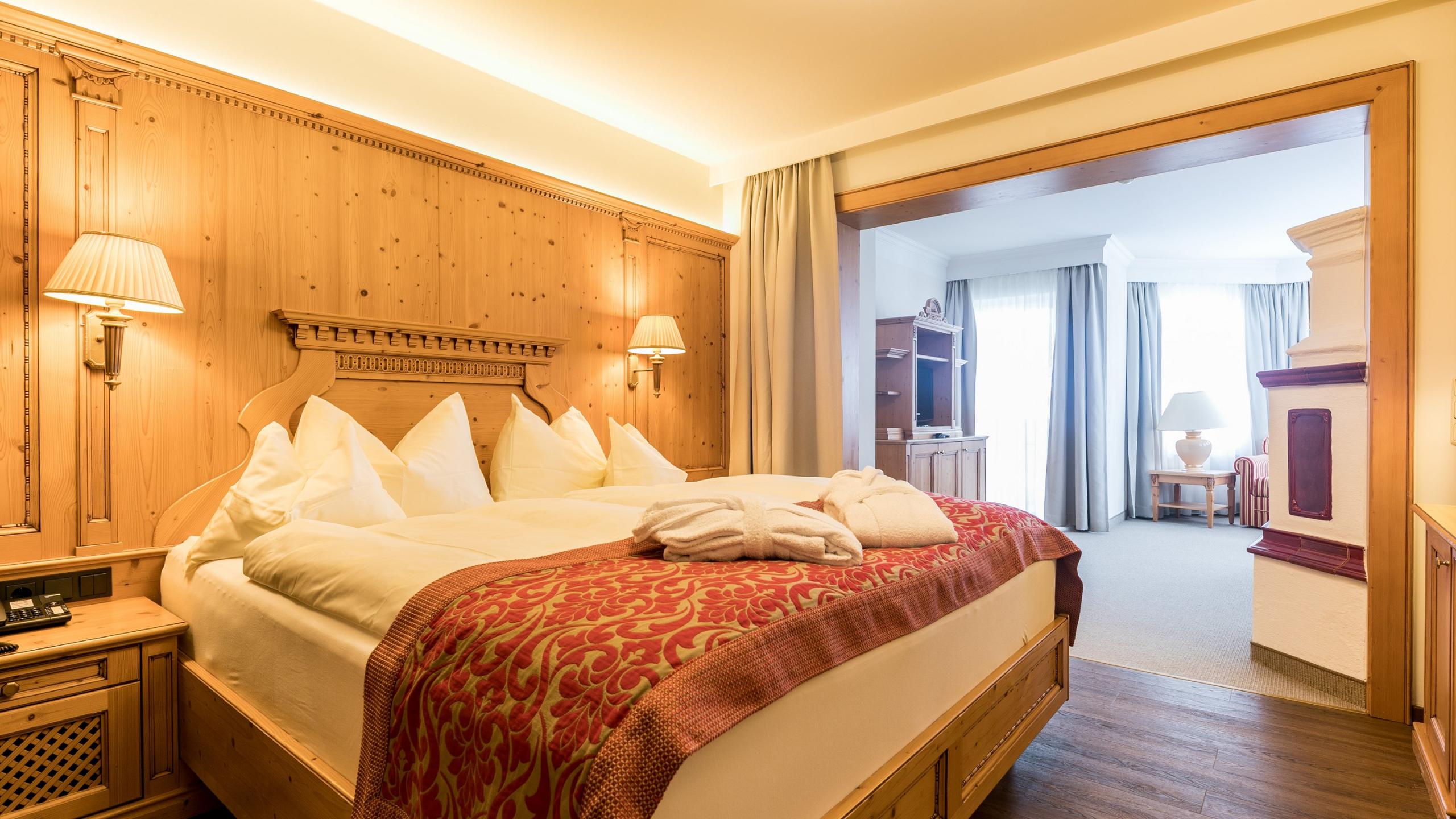 Comfort-Doppelzimmer mit Schlafzimmer mit Holzboden, Wohnbereich mit Teppichboden und Balkon. Ausgestattet im modernen Landhausstil mit Doppelbett, Wohncouch, Kamin, Schreibtisch, Schrank, TV, Minibar und Tresor. Badezimmer mit Dusche, modernem Waschtisch, Schminkspiegel, Föhn und separatem WC.<