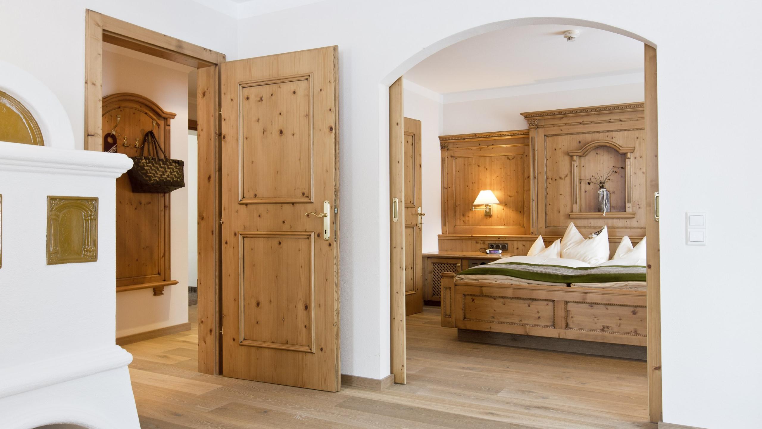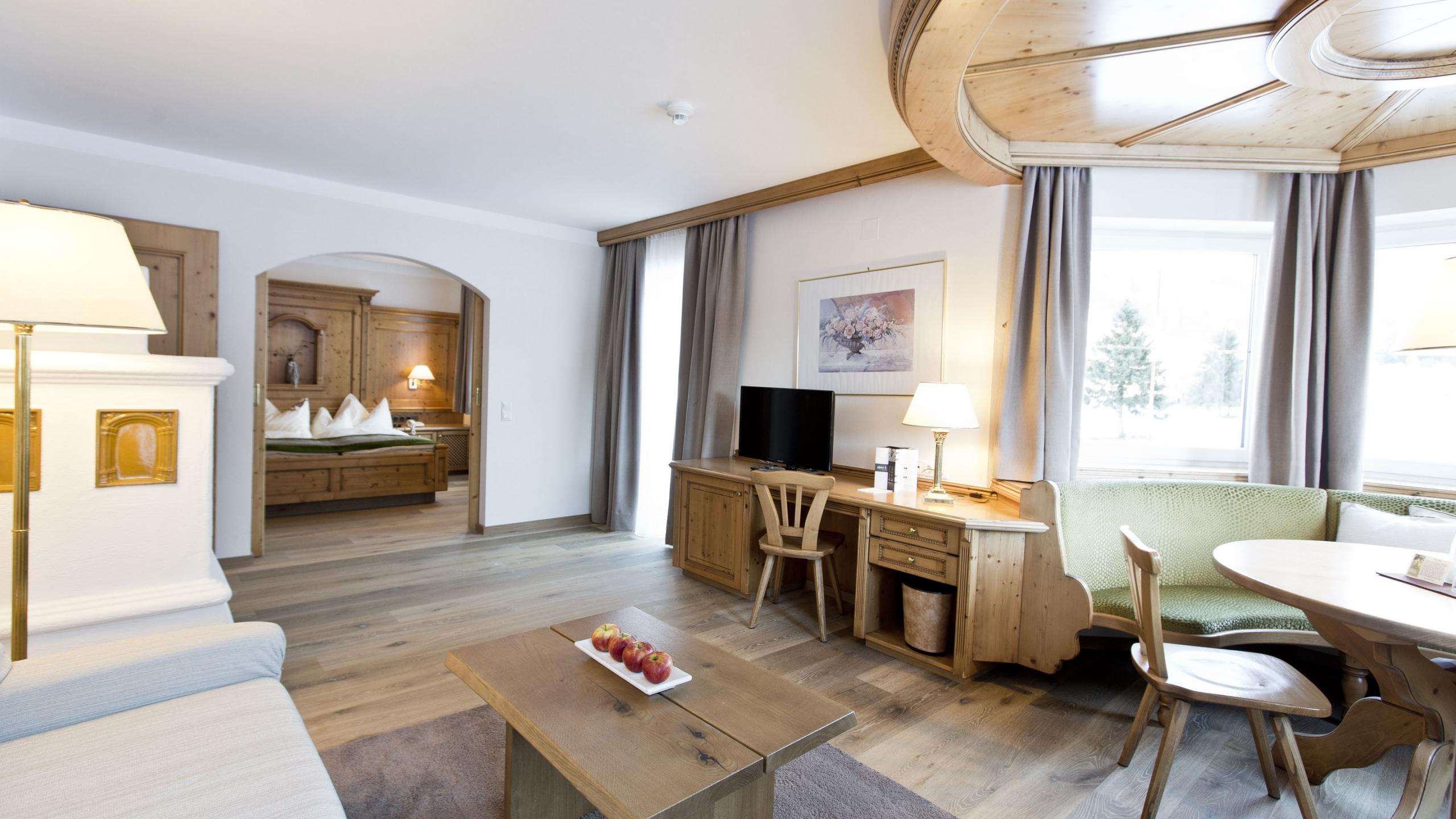 Turm-Suite de luxe im modernen Landhausstil mit Holzboden, Schlafzimmer, Turm-Wohnzimmer mit Sitzecke und Kachelofen, begehbarem Schrank, Südbalkon, TV, Minibar, Telefon und Tresor. Badezimmer mit Badewanne, Dusche und separatem WC.